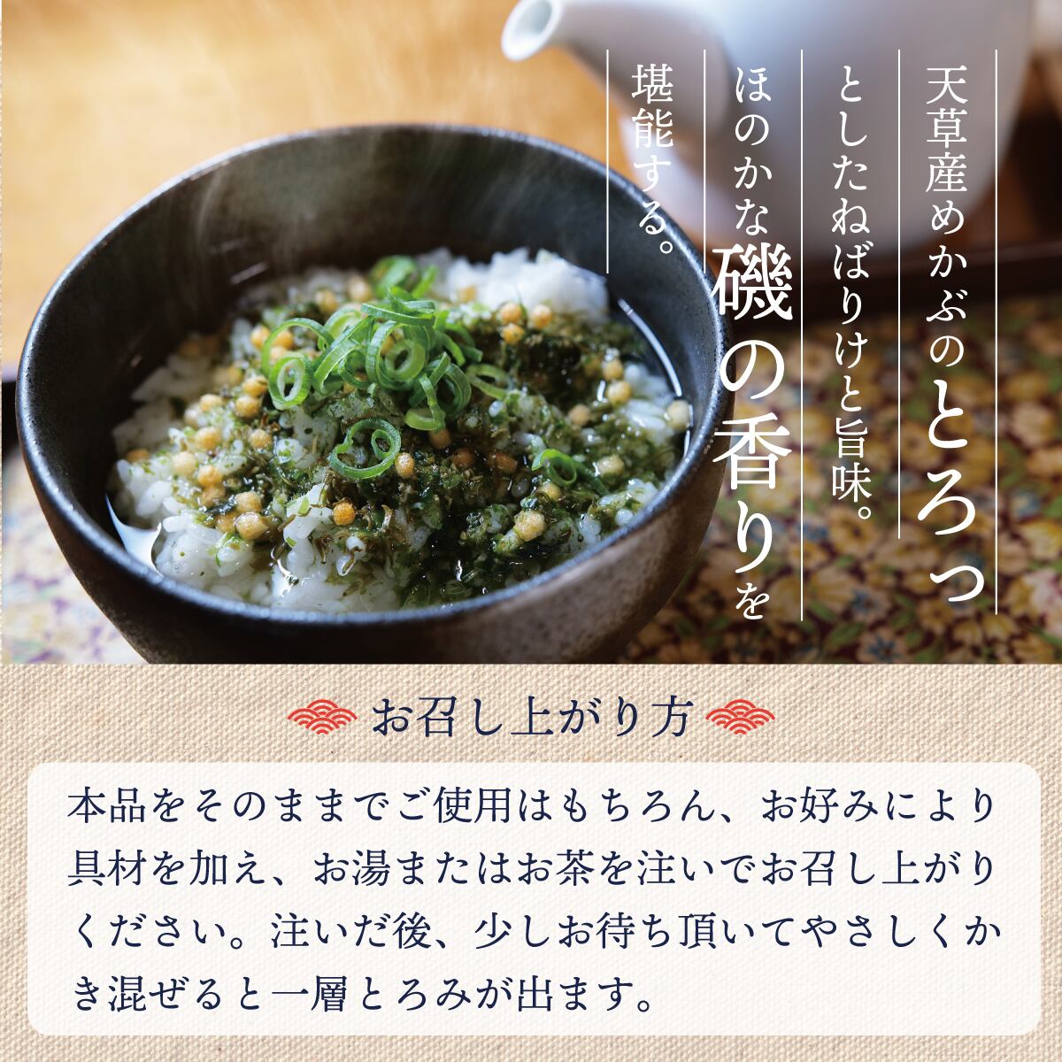 国産の新鮮な天草産メカブを使用した、風味豊かな茶漬けの素です。個包装で使いやすく、10杯分の便利なサイズ!