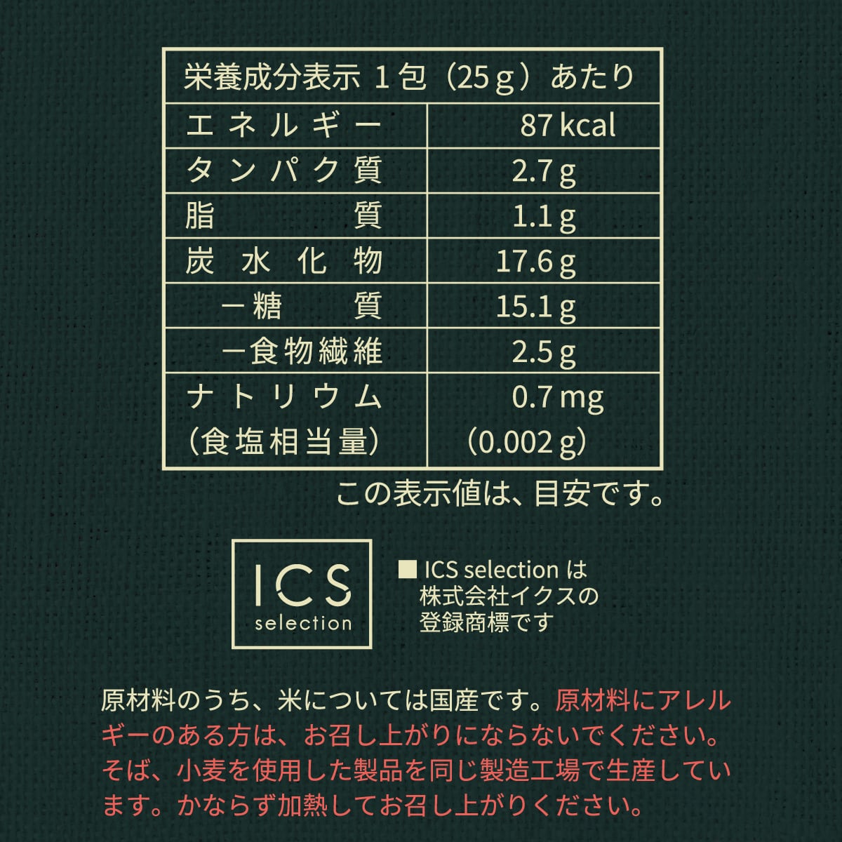 原材料:胚芽押麦(大麦(国産))、はだか麦(大麦(国産))、押麦、黒米、もち麦、オーツ麦、黒大豆、アマランス、大豆、赤米、もちきび、はと麦、もちあわ、青肌玄米、キヌア、とうもろこし、発芽玄米、緑米、もち玄米、チアシード、ヘンプシード