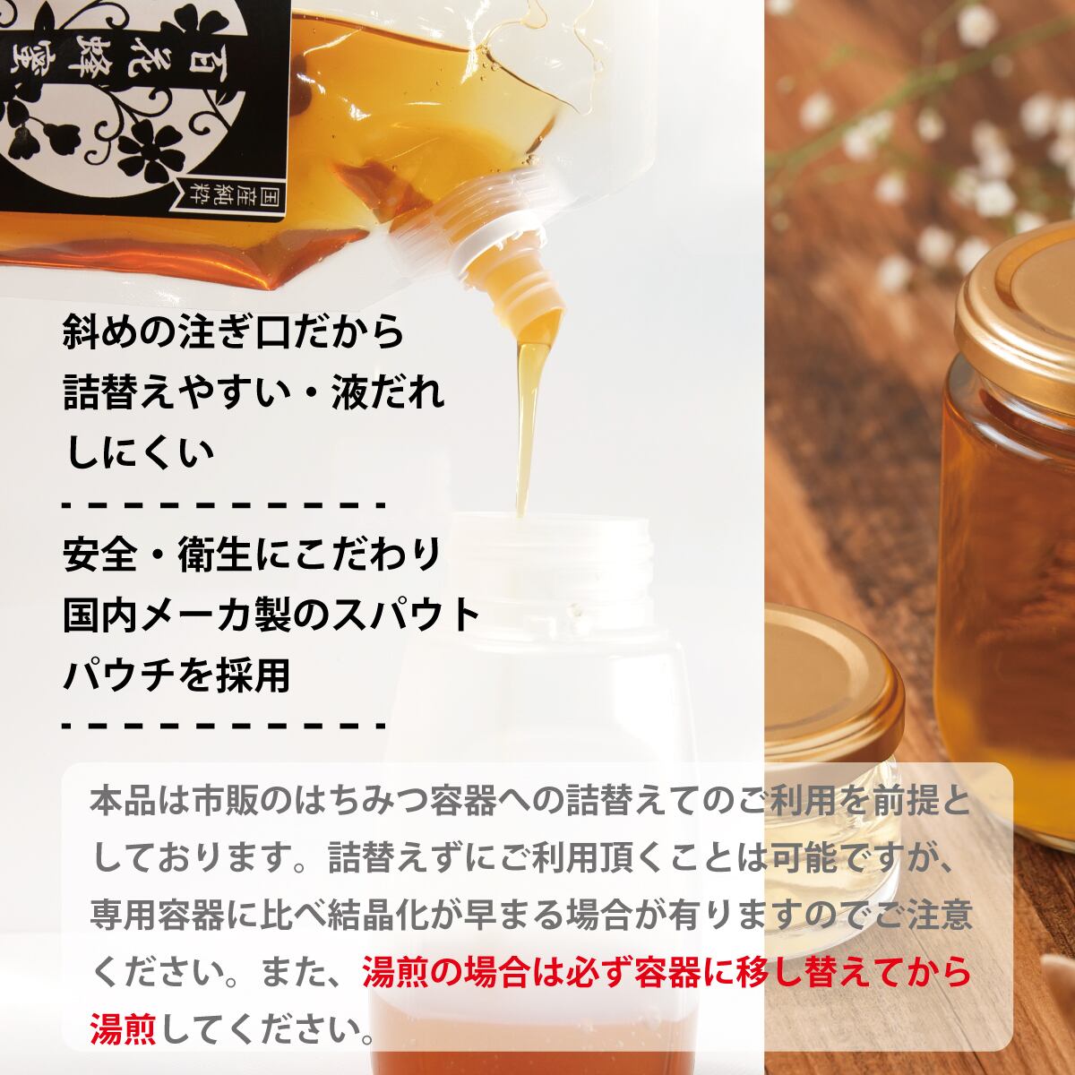 注ぎ口は斜めの国産パウチを使用しており、詰め替えがしやすく、液だれしにくい設計です。使い勝手の良さにこだわった商品で、蜂蜜を手軽に楽しみたい方にぴったりです。